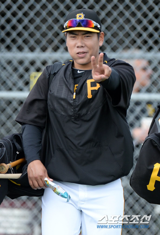 피츠버그 파이어리츠의 강정호가 2일(한국시간) 미국 플로리다 브래든턴의 파이어리츠 시티에서 펼쳐진 팀의 첫 공식훈련에 참가해 구슬땀을 흘리고 있다. 강정호가 밝은 표정으로 동료들과 대화하며 워밍업을 하고 있다.