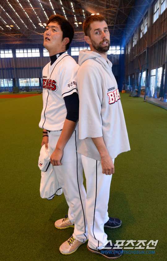 두산베어스 선수들이 22일 미야자키 소켄 스타디움에서 실내훈련을 펼쳤다. 훈련을 마친 장민익과 니퍼트가 서로의 웃으면서 포즈를 취하고 있다. 일본 미야자키에 2차캠프를 차린 두산베어스는 오는 3월 3일 까지 소프트뱅크, 라쿠텐, 오릭스, 세이부등 일본 프로팀들과 총 6차례의 연습경기를 통해 실전감각을 끌어올릴 예정이다. 난고(일본)=최문영 기자 deer@sportschosun.com /2015.02.22/ |
