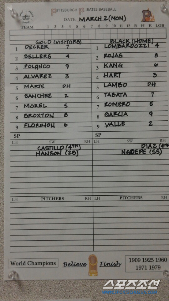 피츠버그가 3일(한국시각) 치르는 팀의 첫 자체 연습경기에 강정호가 주전팀(블랙) 3번 유격수로 선발 출전한다. 경기를 하루 앞둔 2일 클럽하우스에 공개된 선발 라인업. 브래든턴(미국)=허상욱 기자 wook@sportschosun.com