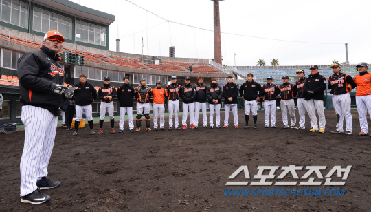 프로야구 롯데 자이언츠가 28일 훈련장인 가모이케 구장에서 자체 청백전을 가졌다. 이종운 감독이 경기를 마친 선수들에게 시상을 하고 있다. 가고시마(일본)=최문영 기자 deer@sportschosun.com /2015.02.28/ |