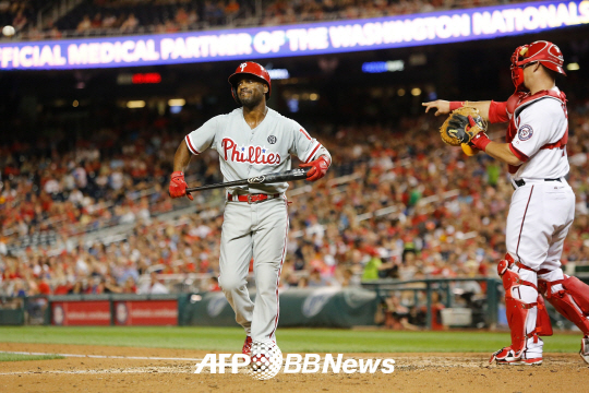| LA 다저스의 톱타자는 지미 롤린스가 맡는다. 지난해 9월 6일(한국시각) 워싱턴 내셔널스와의 경기에서 삼진을 당하고 물러나는 롤린스. ⓒAFPBBNews = News1 |