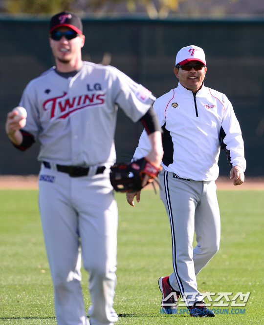LG 트윈스가 미국 애리조나 피닉스의 글렌데일 다저스 스프링캠프장에서 전지훈련에 임했다. 양상문 감독이 루카스 하렐의 훈련을 지켜보고 있다. 글렌데일(미국 애리조나) 송정헌 기자 songs@sportschosun.com/2015.01.24