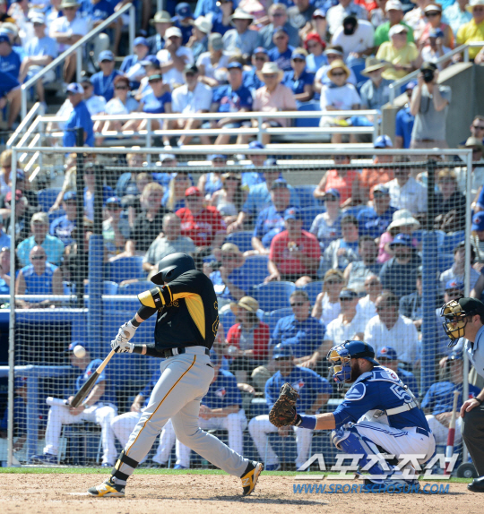 피츠버그 파이어리츠의 강정호가 시범경기에서 첫 안타이자 첫 홈런포를 가동했다. 강정호는 4일(한국시간) 미국 플로리다 주 더네딘의 플로리다 오토 익스체인지 스타디움에서 펼쳐진 2015 메이저리그 시범경기 토론토 블루제이스와의 경기에 6번타자 유격수로 선발출장했다. 5대0으로 앞선 3회초 2사 타석에 들어선 강정호는 토론토의 바뀐 투수 마르코 에스트라다를 상대로 우중월 담장을 넘기는 솔로홈런을 날렸다. 5회초 타석에 선 강정호가 타격자세르 취하고 있다. 더네딘(미국 플로리다)=허상욱 기자 wook@sportschosun.com/2015.03.04
