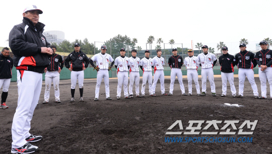 프로야구 제10구단 kt위즈가 3일 자체 청백전을 끝으로 미야자키와 가고시마에서의 48일간의 맹훈련을 마쳤다. 대장정을 마친 조범현 감독이 선수들의 훈련성과에 대해 격려하고 있다. 일본 가고시마에 스프링캠프를 차리고 라쿠텐, 소프트뱅크 등 일본 프로팀과 국내팀 롯데와 연습경기를 통해 실전능력을 키운 kt위즈는 다음날인 4일 모든 훈련일정을 마치고 귀국한다. 가고시마(일본)=최문영 기자 deer@sportschosun.com /2015.03.03/ |