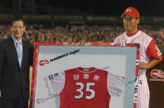 한화 이글스의 홈구장인 대전구장에 들어서면 관중석 한쪽에 걸린 '35번'과 '21번', '23번'이 눈에 들어온다. 한화의 '영원한 홈런왕' 장종훈과 '최다승 투수' 송진우 '에이스' 정민철이 선수 시절에 사용했던 등번호다. '명예의전당'이 없는 한국 프로야구에서 영구결번은 최고의 영예다. 압도적인 성적, 소속팀에 대한 헌신이 없다면 불가능한 게 영구결번이다.
