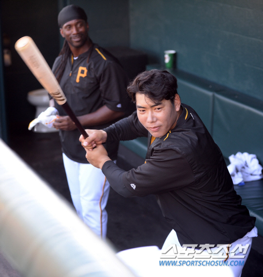 2015 메이저리그 시범경기 피츠버그 파이어리츠와 토론토 블루제이스의 경기가 5일(한국시간) 미국 플로리다 주 브래든턴의 맥케크니 필드에서 펼쳐졌다. 덕아웃에 있던 강정호가 앤드류 맥커친과 이야기를 나누고 있다. 전날 열린 토론토와의 첫 시범경기에서 6번 유격수로 선발출장해 첫 안타를 솔로홈런으로 장식하며 활약을 펼쳤던 강정호는 홈 개막전인 오늘 경기에 결장했다. 브래든턴(미국 플로리다)=허상욱 기자 wook@sportschosun.com/2015.03.05/