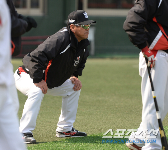 8일 오전 서울 목동야구장에서 열릴 2015 프로야구 시범경기 KT와 넥센의 경기에 앞서 KT 조범현 감독이 선수들과 함께 몸을 풀고 있다. 목동=김경민 기자 kyungmin@sportschosun.com