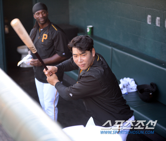 ◇지난 5일 토론토와의 시범경기에서 덕아웃에 있던 강정호가 앤드류 맥커친과 이야기를 나누고 있다. 브래든턴(미국 플로리다)=허상욱 기자 wook@sportschosun.com