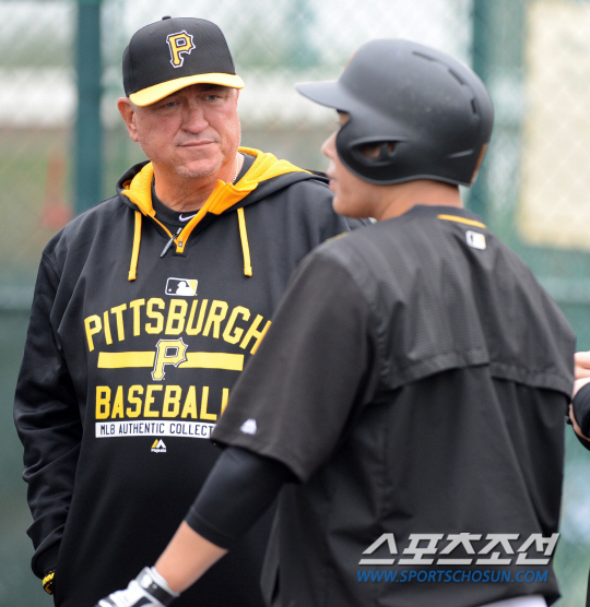 강정호가 타격훈련 하던 중 클린트 허들 감독의 이야기를 듣고 있다. 브래든턴(미국)=허상욱 기자 wook@sportschosun.com/2015.03.01/