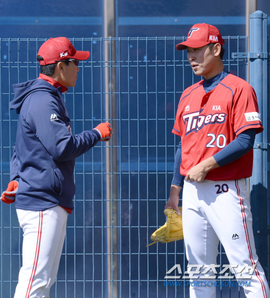 10일 포항야구장에서 2015 KBO리그 시범경기 삼성과 KIA의 경기가 열릴 예정이었으나 한파로 인해 취소됐다. KIA로 복귀한 윤석민이 동료들과 함게 훈련에 임했다. 불펜 피칭 도중 이대진 코치(왼쪽)와 대화를 나누고 있는 윤석민. 포항=송정헌 기자 songs@sportschosun.com/2015.03.10