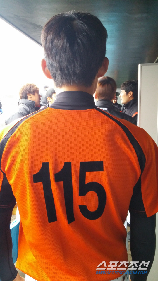 그런데 눈에 띄는게 있다. 등에 꽉 찬 번호. 강동수의 등번호는 115번이다. 보통 세자릿수 등번호는 육성선수들이나 신인 중 일부 선수들이 단다. 그런데 1군 엔트리 진입이 유력한 선수가 세자릿수 등번호이니 여간 폼이 나지 않는다. 보통 구단들은 세자릿수 등번호를 단 육성선수나 신인급 선수들이 1군에 합류하면 두자릿수 등번호로 바꿔주는게 일반적이다.