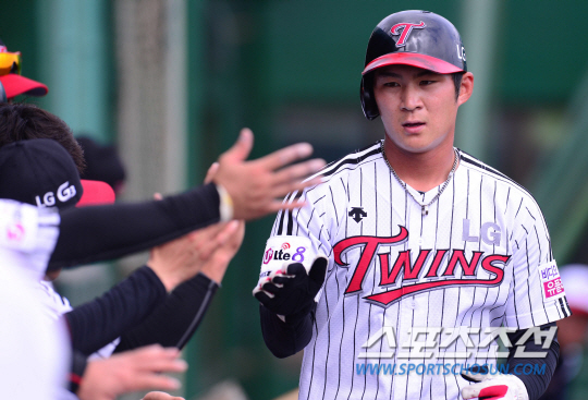 22일 오후 일본 오키나와 이시가와 구장에서 SK와 LG의 연습경기가 열렸다. 3회말 1사 3루서 3루주사 LG 오지환이 채은성 타석 때 볼이 빠진 틈을 타 홈에 들어와 동료들과 하이파이브를 나누고 있다. 오키나와(일본)=김경민 기자 kyungmin@sportschosun.com / 2015.02.22. |