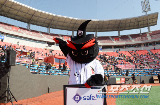 수원 kt위즈파크가 화려한 개장을 했다. 14일 수원 kt 위즈 파크에서 두산과 kt의 2015 프로야구 시범경기가 열렸다. kt 마스코트 빅이 그라운드에 나와 있다. 수원 kt위즈파크는 지상 4층, 연면적 1만 9,000㎡, 관람석 2만석 규모로 관중편의와 선수 친화적인 구장으로 리모델링됐다. 이날 개장식에는 치어리더 공연과 걸그룹 EXID의 축하공연이 펼쳐질 예정이다. 수원=정재근 기자 cjg@sportschosun.com/2015.03.14/ |