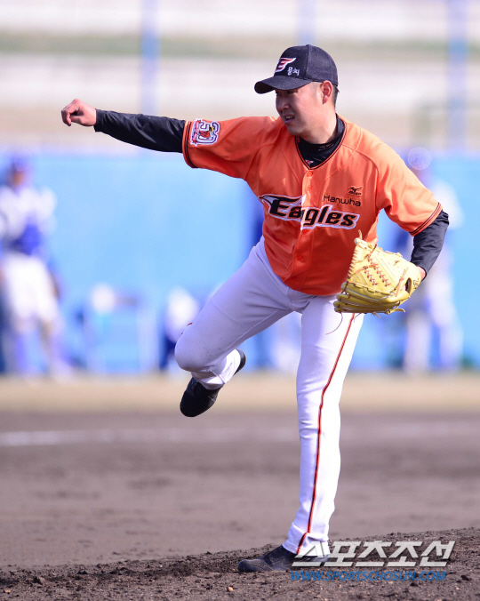 21일 오후 일본 오키나와 아카마 구장에서 한화와 삼성의 연습경기가 열렸다. 한화 송은범이 힘차게 볼을 던지고 있다. 오키나와(일본)=김경민 기자 kyungmin@sportschosun.com / 2015.02.21.