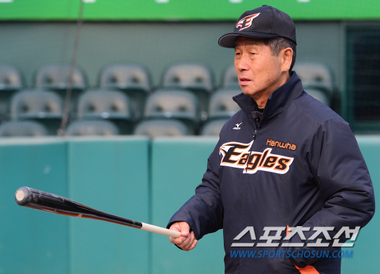 13일 대전 한밭야구장에서 KBO리그 시범경기 한화 이글스와 두산 베어스의 경기가 열렸다. 한화 선수들이 경기 종료 후 훈련에 임하고 있다. 선수들의 훈련을 지켜보고 있는 김성근 감독. 대전=송정헌 기자 songs@sportschosun.com/2015.03.13 |