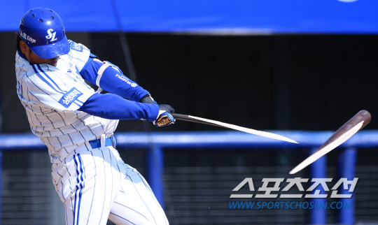 11일 경북 포항야구장에서 KBO리그 시범경기 삼성 라이온즈와 KIA 타이거즈의 경기가 열렸다. 1회 첫 타석에서 박석민이 내야 땅볼 타구로 물러났다. 타격을 하며 방망이가 부러지고 있는 박석민. 포항=송정헌 기자 songs@sportschosun.com/2015.03.11