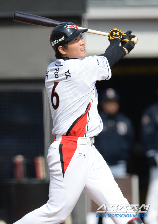박경수가 진지한 설명을 해줬다. 그는 "지난해까지 나는 상체로만 공을 치는 타자였다. 그래서 스프링캠프부터 이숭용 코치님과 함께 노력했다. 하체 운동에 힘썼고, 타격시에도 하체를 이용한 타격을 위해 연습했다"라고 했다. 그 2루타 타구가 훈련의 결실이었다. 하체가 안정됐기에 바깥쪽 직구를 힘있게 밀어낼 수 있었다.