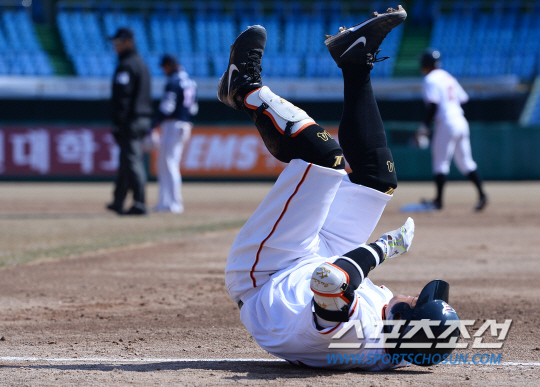 12일 대전 한밭야구장에서 KBO리그 시범경기 한화 이글스와 두산 베어스의 경기가 열렸다. 한화 조인성이 2회 안타를 치고 1루로 달리던 도중 오른쪽 종아리 통증을 호소하며 그라운드에 쓰러지고 있다. 고통스러워 하고 있는 조인성. 대전=송정헌 기자 songs@sportschosun.com/2015.03.12