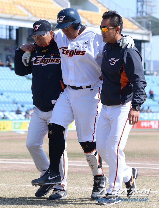 12일 대전 한밭야구장에서 KBO리그 시범경기 한화 이글스와 두산 베어스의 경기가 열렸다. 한화 조인성이 2회 안타를 치고 1루로 달리던 도중 오른쪽 종아리 통증을 호소하며 그라운드에 쓰러지고 있다. 교체 되고 있는 조인성. 대전=송정헌 기자 songs@sportschosun.com/2015.03.12