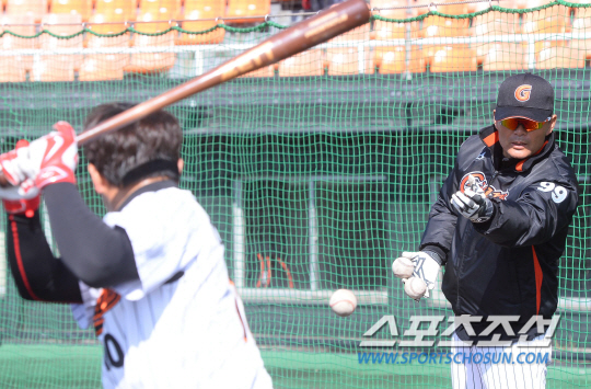 프로야구 롯데 자이언츠와 KT위즈의 연습경기가 27일 가고시마 가모이케 구장에서 열렸다. 경기전 롯데 이종운 감독이 하준호에게 배팅볼을 던져주며 지도하고 있다.가고시마(일본)=최문영 기자 deer@sportschosun.com