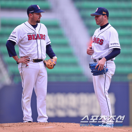 ◇17일 오후 서울 잠실야구장에서 2015 프로야구 시범경기 두산과 NC의 경기에 열렸다. 3회초 두산 마야가 팀 동료 루츠에게 가슴 통증을 호소하고 있다. 김경민 기자 kyungmin@sportschosun.com
