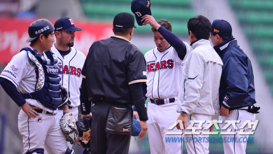 ◇17일 오후 서울 잠실야구장에서 2015 프로야구 시범경기 두산과 NC의 경기에 열렸다. 3회초 두산 마야가 가슴 통증을 호소하며 마운드에 오른 코칭스텝과 이야기를 나누고 있다. 김경민 기자 kyungmin@sportschosun.com