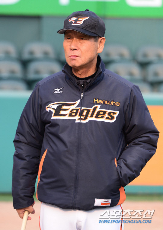 13일 대전 한밭야구장에서 KBO리그 시범경기 한화 이글스와 두산 베어스의 경기가 열렸다. 한화 선수들이 경기 종료 후 훈련에 임하고 있다. 선수들의 훈련을 지켜보고 있는 김성근 감독. 대전=송정헌 기자 songs@sportschosun.com/2015.03.13