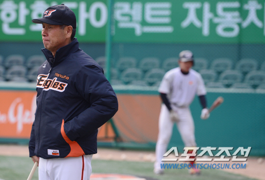 13일 대전 한밭야구장에서 KBO리그 시범경기 한화 이글스와 두산 베어스의 경기가 열렸다. 한화 선수들이 경기 종료 후 훈련에 임하고 있다. 선수들의 훈련을 지켜보고 있는 김성근 감독. 대전=송정헌 기자 songs@sportschosun.com/2015.03.13
