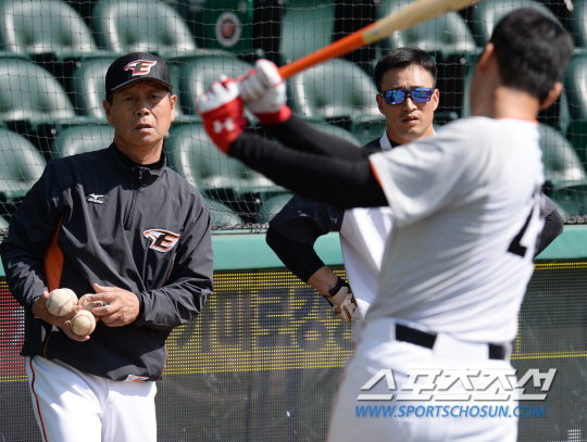 롯데 자이언츠와 한화 이글스의 프로야구 시범경기가 19일 대전구장에서 열린다. 경기 전 한화 김성근 감독이 최진행에게 배팅볼을 던져주며 타격폼에 대해 조언을 하고 있다.