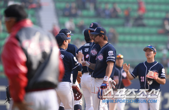21일 잠실구장에서 KBO리그 시범경기 LG와 두산의 경기가 열렸다. 두산이 LG에 5대4로 승리했다. 경기 종료 후 하이파이브를 나누고 있는 두산 선수들. 잠실=송정헌 기자 songs@sportschosun.com/2015.03.21 |