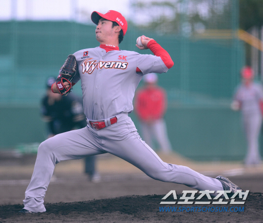 22일 오후 일본 오키나와 이시가와 구장에서 SK와 LG의 연습경기가 열렸다. SK 진해수가 힘차게 볼을 던지고 있다. 오키나와(일본)=김경민 기자 kyungmin@sportschosun.com / 2015.02.22. |