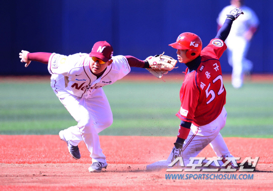 13일 오후 서울 목동야구장에서 2015 프로야구 시범경기 KIA와 넥센의 경기가 열렸다. 4회초 2사 1루서 1루주자 최용규가 김주찬 타석 때 2루도루에 실패하고 있다. 넥센 2루수는 김민성 목동=김경민 기자 kyungmin@sportschosun.com / 2015.03.13.