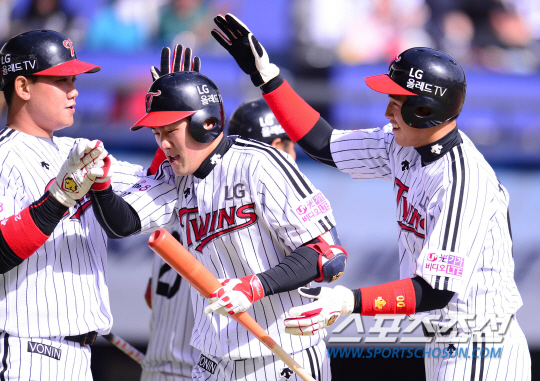 22일 오후 서울 잠실야구장에서 2015 프로야구 LG와 두산의 시범경기가 열렸다. 5회말 1사 2,3루서 LG 양석환이 좌월 3점 홈런을 친 후 홈에서 최승준, 채은성과 환호하고 있다. 잠실=김경민 기자 kyungmin@sportschosun.com / 2015.03.22.