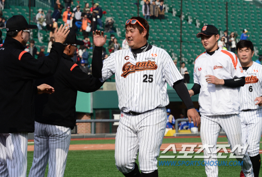 삼성 라이온즈와 롯데 자이언츠의 2015 프로야구 시범경기가 17일 울산 문수구장에서 열렸다. 롯데가 5-3의 승리를 거둔 가운데 최준석이 밝게 웃으며 이종운 감독과 하이파이브를 하고 있다. 울산=정재근 기자 cjg@sportschosun.com/2015.03.17/