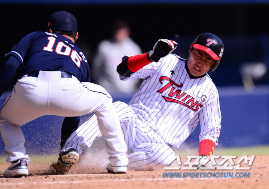 22일 오후 서울 잠실구장에서 LG와 두산의 시범경기가 열렸다. 4회말 1사 1,2루서 LG 2루 주자 채은성이 손주인 타석 때 두산 박성민의 폭투를 틈타 홈에 뛰어들어 세이프되고 있다. 잠실=김경민 기자 kyungmin@sportschosun.com / 2015.03.22.
