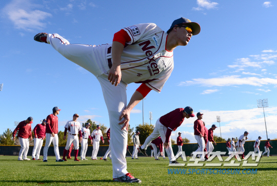 넥센 히어로즈가 미국 애리조나 서프라이즈에서 스프링캠프 전지훈련을 펼쳤다. 넥센 선수들이 스트레칭으로 몸을 풀고 있다. 서프라이즈(미국 애리조나)송정헌 기자 songs@sportschosun.com/2015.01.28 |