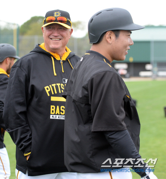 피츠버그 파이어리츠의 클린트 허들 감독(왼쪽)과 강정호. 브래든턴(미국)=허상욱 기자 wook@sportschosun.com/2015.02.28/