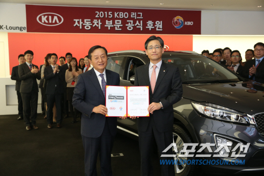 KBO는 25일 기아자동차와 서울 압구정동 기아자동차 사옥에서 KBO 양해영 사무총장, 기아자동차 김창식 국내영업본부장(부사장) 등이 참석한 가운데 '2015 KBO 리그' 자동차 부문 후원 계약을 체결하고 조인식을 가졌다.