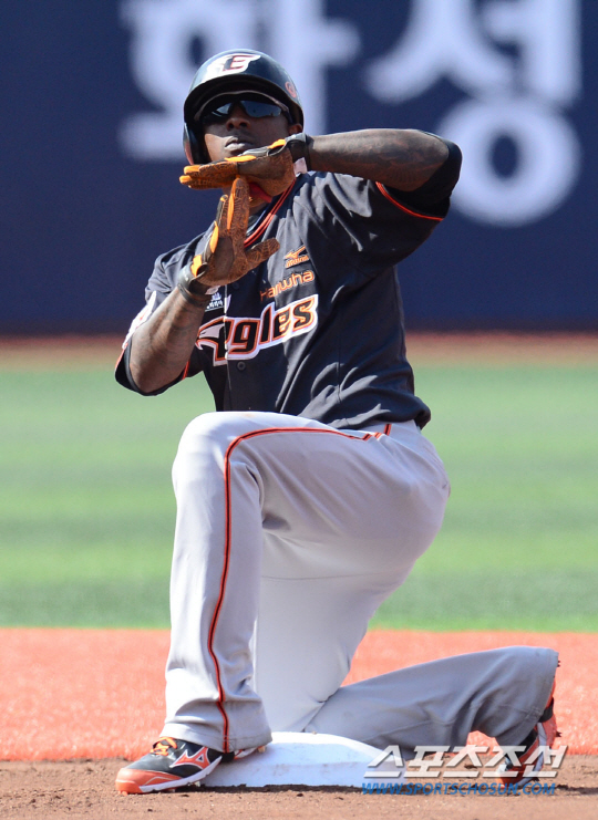 한화 이글스와 넥센 히어로즈의 2015 프로야구 개막전이 28일 목동구장에서 열렸다. 4회초 무사 한화 모건이 우측 펜스를 맞히는 2루타를 친 후 타임요청을 하고 있다. 목동=정재근 기자 cjg@sportschosun.com/2015.03.28/