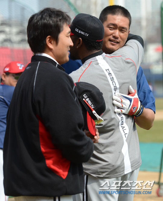 KIA와 LG의 2015 KBO리그 경기가 29일 광주 기아챔피언스필드에서 예정된 가운데 양팀 선수들이 훈련을 펼쳤다. KIA 최희섭이 LG 소사와 인사를 나누고 있다.광주=허상욱 기자 wook@sportschosun.com