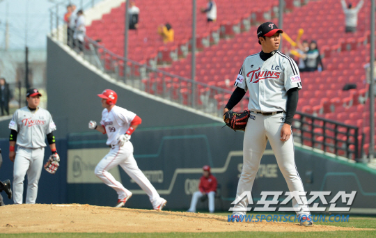 이길 수 있었던 두 경기를 전부 내줬다. 첫 경기는 수많은 득점 찬스에서 한방이 아쉬웠고, 두 번째 경기는 믿었던 LG 불펜이 무너지면서 역전패했다. KIA와 LG의 2015 KBO 리그 경기가 29일 광주기아챔피언스필드에서 열렸다. 3회말 1사 1,2루 KIA 필이 LG 임지섭의 투구를 받아쳐 좌측담장을 넘어가는 역전 3점홈런을 날렸다. 홈런을 허용한 임지섭이 아쉬워하는 모습. 광주=허상욱 기자 wook@sportschosun.com/2015.03.29/
