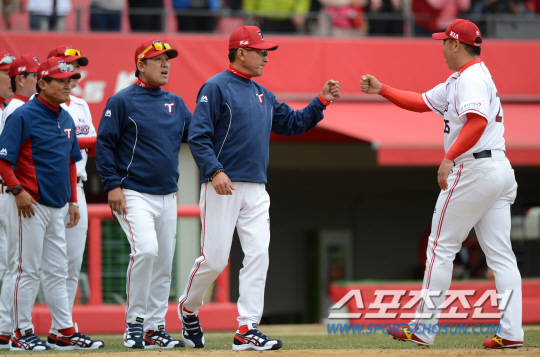 KIA와 LG의 2015 KBO 리그 개막전 경기가 28일 광주기아챔피언스필드에서 열렸다. KIA가 3대1로 개막전 승리를 따냈다. 김기태 감독이 선수들과 하이파이브를 하는 모습. 광주=허상욱 기자 wook@sportschosun.com/2015.03.28/