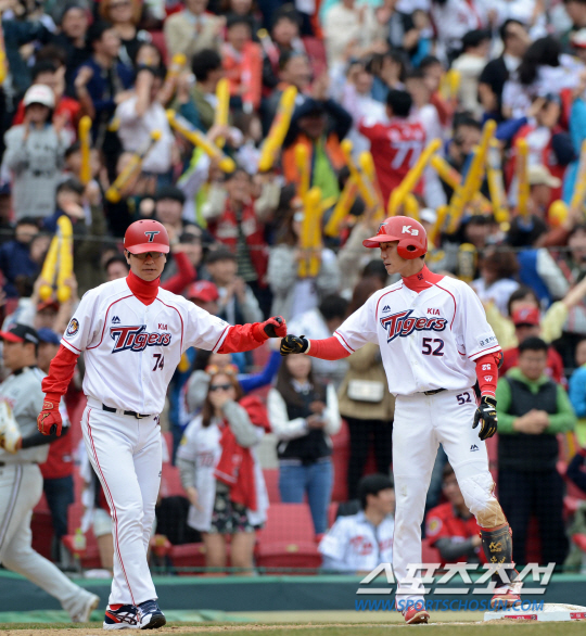 | KIA와 LG의 2015 KBO 리그 개막전 경기가 28일 광주기아챔피언스필드에서 열렸다. 7회말 무사 1루 KIA 최용규가 우중간에 떨어지는 1타점 3루타를 치고 김종국 3루 코치와 하이파이브를 하고 있다.광주=허상욱 기자 wook@sportschosun.com/2015.03.28/ |