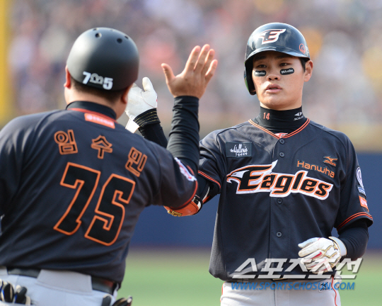 한화 이글스와 넥센 히어로즈의 2015 프로야구 개막전이 28일 목동구장에서 열렸다. 6회초 2사 3루 한화 강경학이 1타점 안타를 친 후 임수민 코치의 축하를 받고 있다. 목동=정재근 기자 cjg@sportschosun.com/2015.03.28/