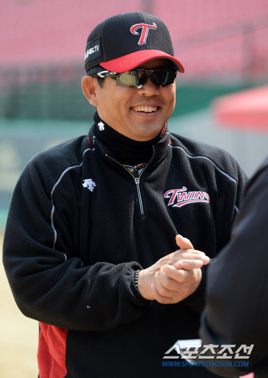 KIA와 LG의 2015 KBO리그 경기가 29일 광주 기아챔피언스필드에서 예정된 가운데 양팀 선수들이 훈련을 펼쳤다. LG 양상문 감독이 취재진과 이야기를 나누고 있다. 광주=허상욱 기자 wook@sportschosun.com/2015.03.29/