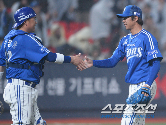 31일 수원 케이티위즈파크에서 KBO리그 kt 위즈와 삼성 라이온즈의 경기가 열렸다. 삼성 임창용이 역대 4번째 200세이브를 달성했다. 임창용은 kt 전에 9회 마운드에 올라 1이닝 무실점 투구하며 세이브를 올렸다. 경기 종료 후 진갑용 포수와 악수를 나누고 있는 임창용. 수원=송정헌 기자 songs@sportschosun.com/2015.03.31
