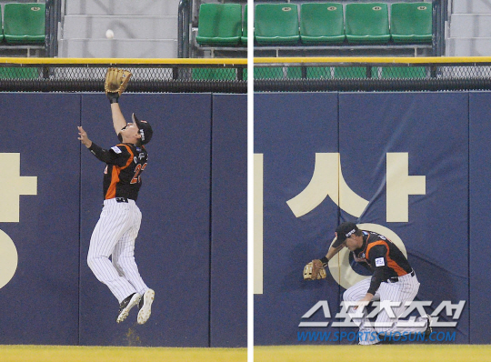 2015 KBO리그 LG트윈스와 롯데자이언츠의 개막전 경기가 31일 잠실야구장에서 열렸다. LG 3회말 2사후 롯데 중견수 아두치가 이병규의 안타성 타구를 펜스플레이로 잡아내고 있다. 잠실=최문영 기자 deer@sportschosun.com /2015.03.31/