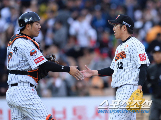 롯데 마무리 김승회와 포수 강민호다. 최문영 기자 deer@sportschosun.com |