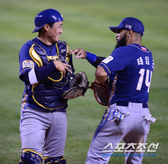김태군의 홈런 때는 '합'이 맞지 않았다. 테임즈가 없던 지난 2013년 9월 7일 인천 SK전 이후 571일만에 나온 김태군의 홈런. 뒤늦게 덕아웃 끝으로 온 테임즈는 미리 준비를 못했는지 하이파이브를 나누고 머리를 치는 선에서 세리머니를 마쳤다.