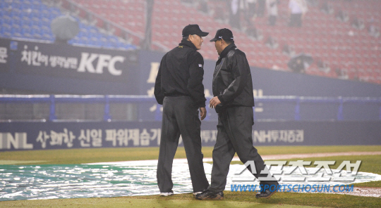 지난 31일 LG와 롯데의 잠실 경기는 8회초 폭우로 인해 강우콜드게임이 선언됐다. 심판원들이 운동장 상황을 살펴보고 있다. 잠실=최문영 기자 deer@sportschosun.com